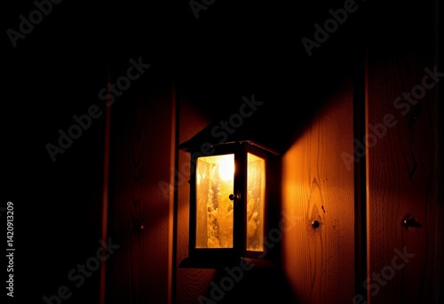 Vintage lantern illuminating a dark wooden environment