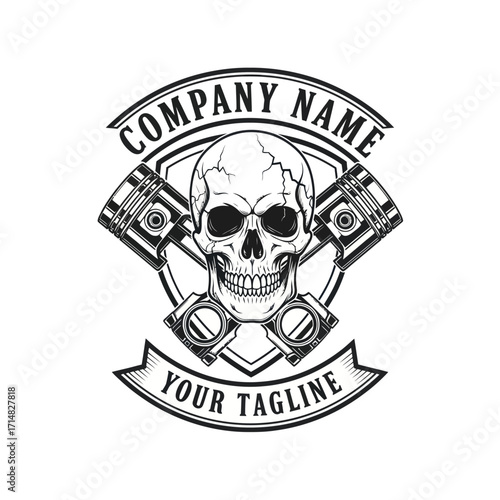 Vintage monochrome skull and crossed engine pistons emblem with company name and tagline banners, ideal for motorcycle clubs or automotive businesses.