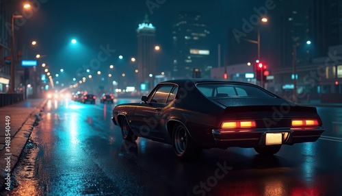 Vintage muscle car on the night street with neon light. 80s styled synthwave retro scene with powerful drive in evening