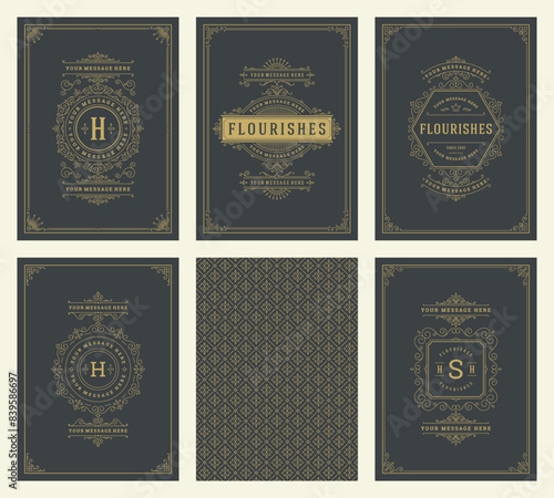 Vintage ornament greeting cards set templates flourish ornate frames and pattern background vector illustration