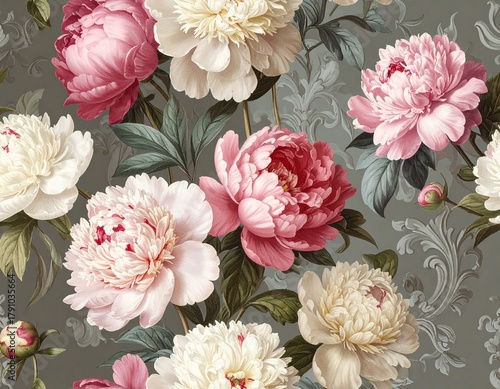 Vintage Peony Floral Pattern Seamless Background in Pink and White on a Dark Teal/Slate Blue Backdrop