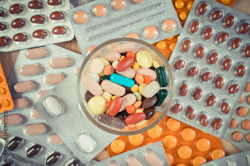 Vintage photo, Heap of colorful medical pills and capsules, health care concept