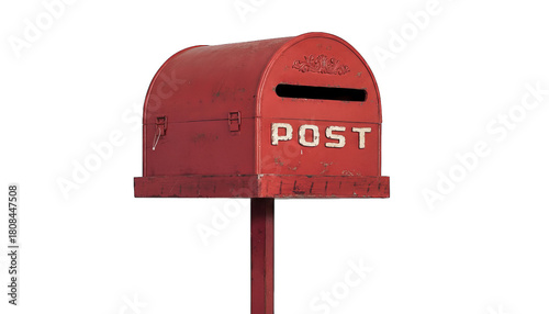 Vintage red metal post box with weathered texture and clear lettering offers rustic charm