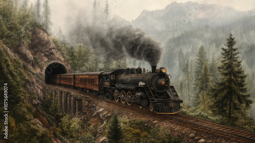 Vintage steam train journeying through forested mountain landscape
