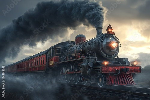 Vintage Steam Train Locomotive with Billowing Smoke, Passenger Cars and Intense Headlights