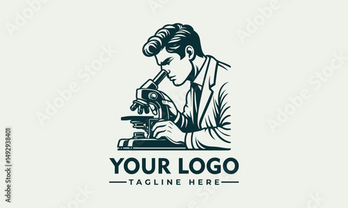 Vintage style male scientist carefully observed a microscope in laboratory research setting. Science concept