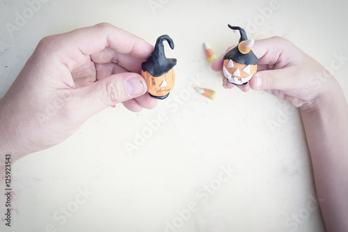 Vintage style photo of father is playing Halloween clay with his son