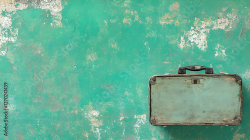 Vintage suitcase on teal wall, travel memories