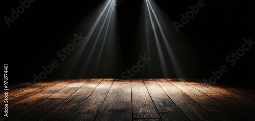 Vintage theater floor illuminated by intense light beams, black backdrop, dramatic and cinematic, wooden planks detailed with shadows, elegant atmosphere