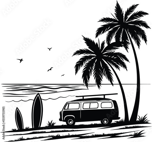 Vintage Van with Surfboards under Palm Trees on Tropical Beach Silhouette