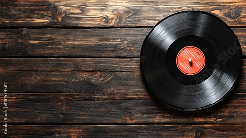 Vintage vinyl record resting on rustic wooden surface for a nostalgic atmosphere