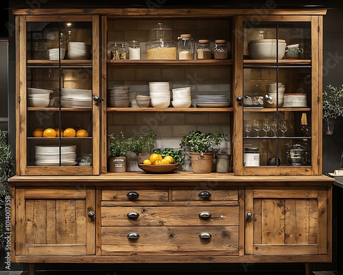 Vintage wooden cabinet glass doors classic kitchen decor warm lighting nostalgic atmosphere rustic furniture
