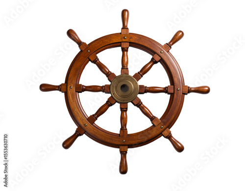 Vintage wooden ship's wheel on a white background.