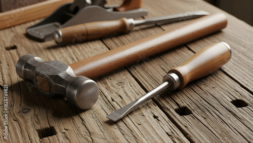 Vintage woodworking tools including a hammer and chisels on a rustic wooden workbench