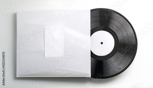Vinyl disc mockup with blank label displayed partly in a record sleeve on a clean surface. Generative AI