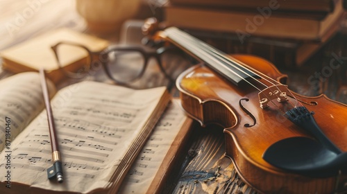 violin and old music books on wooden table, vintage toned photo.