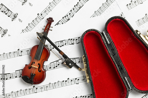 Violin and red fiddle case on paper music notes with copy space