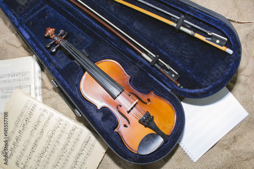 Violin neck on music papers background