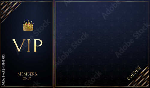 VIP party invitation with golden crown and flashes of light. Radiance and light on a dark blue background. Gold luxury elegant vip. Vector illustration