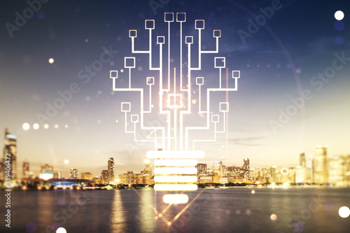 Virtual creative idea concept with light bulb and microcircuit illustration on Chicago skyline background. Neural networks and machine learning concept. Multiexposure