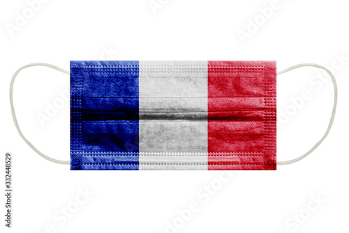 Virus mask with flag of france on an isolated white background. Symbol of protection against coronavirus infection.