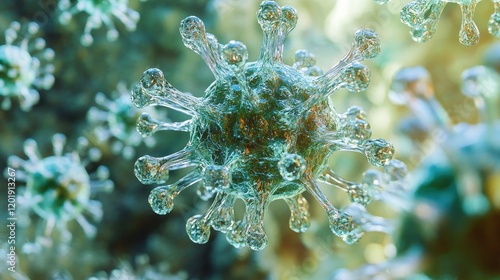 Virus with a crystalline structure, [virus, scientific art, unique design], [prismatic colors, intricate details, futuristic look]