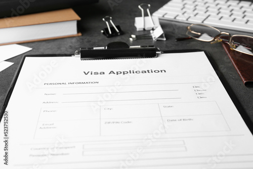Visa application form for immigration and stationery on grey table, closeup