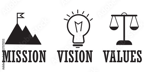 Vision, mission and values editable stroke outline icons set isolated on white background flat vector illustration