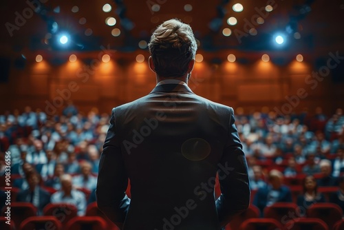 Visionary leader inspiring large audience spotlight focused determined face professional setting
