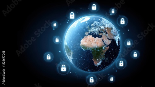 Visual representation of a globe surrounded by digital locks, symbolizing global cybersecurity and data protection.