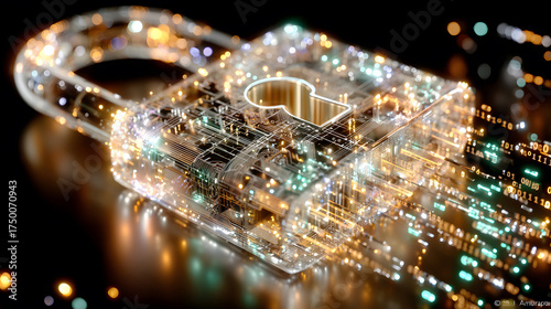 Visualization of digital cybersecurity featuring glowing lock and shield