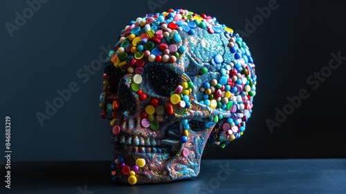 Visualize the vibrancy of life amidst mortality with a captivating stock photo featuring a human skull formed from an array of colorful beads, symbolizing the enduring spirit of humanity.