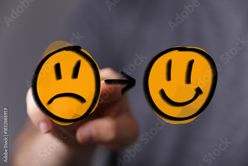 Visualizing the process of emotional transformation, this image shows a sad face evolving into a happy face, symbolizing improvement and optimis