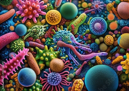 Vivid microscopic view of colorful bacteria, viruses, and microorganisms.