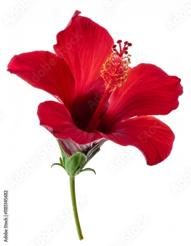 Vivid red hibiscus flower blossoming, showcasing intricate petals with crisp white studio backdrop, emphasizing natural botanical beauty