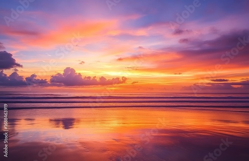 Vivid Sunset Over the Ocean with Reflective Beach