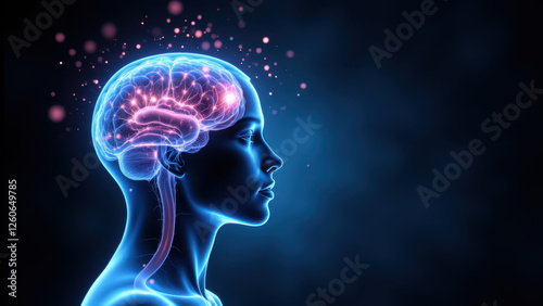 VNS - Vagus Nerve Stimulation in a human head model with glowing lines representing neural pathways.