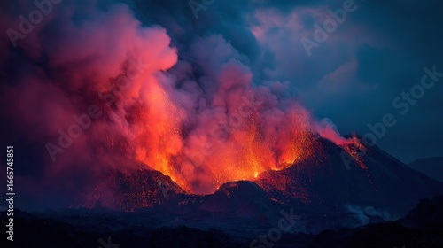 Volcano erupting at night
