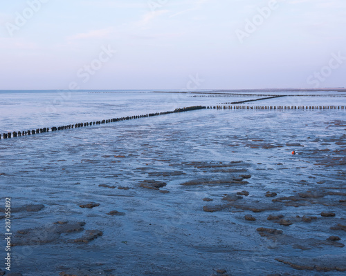 waddenzee or wadd sea during sunset seen from jetty of ameland ferry