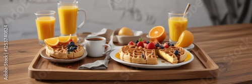 Waffle breakfast set with coffee and orange juice on a wooden tray, coffee break, energizing, fresh juice, complete meal