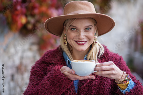 Waist up portrait of happy young woman is drinking coffee outdoor. She is looking at camera and smiling. Autumn leaves on background