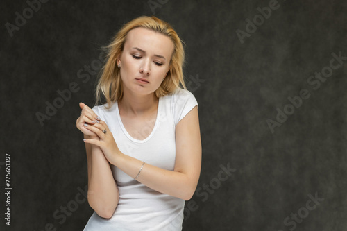 Waist up portrait of pretty interesting fashionable blonde girl on gray background in white t-shirt. Standing in front of the camera, smiling, showing hands. Shows a lot of emotions.