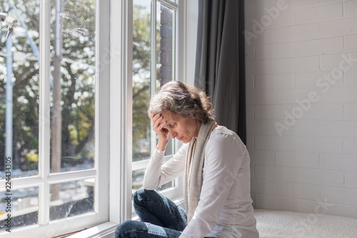 Waist up view of middle aged woman sitting by window resting head on her hand (selective focus)