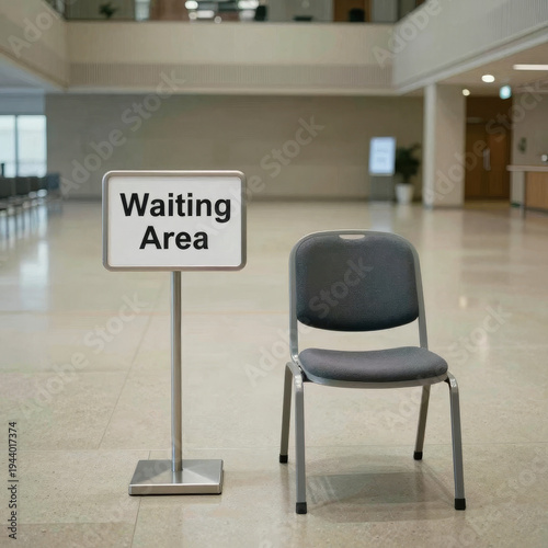 Waiting area sign beside single chair inside quiet hospital lobby corridor illustrating organized seating and patient flow within healthcare facility