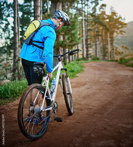 Walking, forest and cyclist with flat tire on bicycle for problem, maintenance or repair. Nature, back view and man with wheel puncture for physical activity, outdoor hobby or cardio training