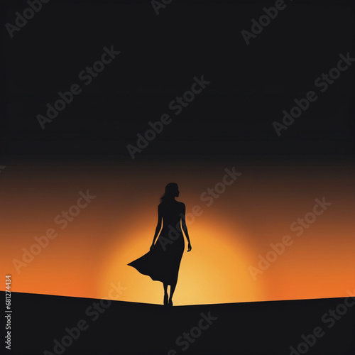 walking on the sun // create a visually captivating minimalist artwork featuring a woman's silhouette in sunset tones against a black background. Emphasize simplicity and elegance.