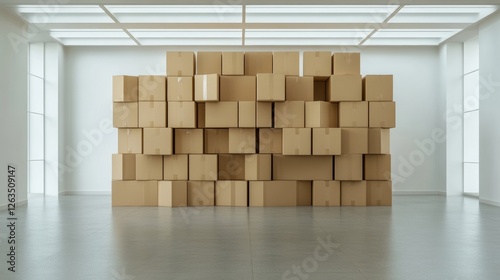 Wall made of closed cardboard boxes stacked in an empty room with a white floor. Concept of delivering goods, consumerism and overproduction. 3d rendering mock up