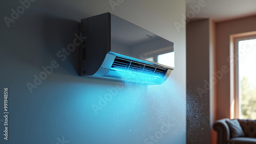 Wall-Mounted Air Conditioning Unit with Cool Air Flow in Modern Living Space