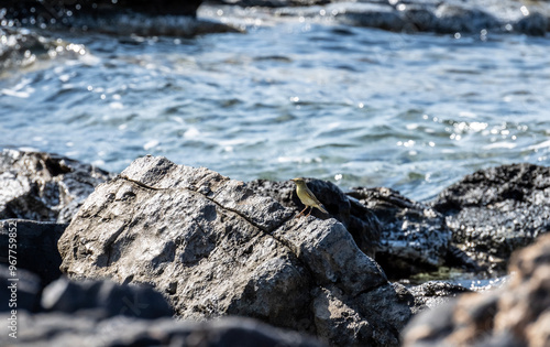 warbler small bird on rocks near the sea looking for food on a hot day on the island of Crete Greece