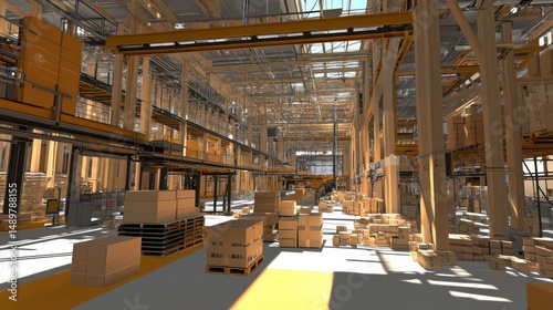 Warehouse interior, boxes stacked, sunlight, industrial, logistics